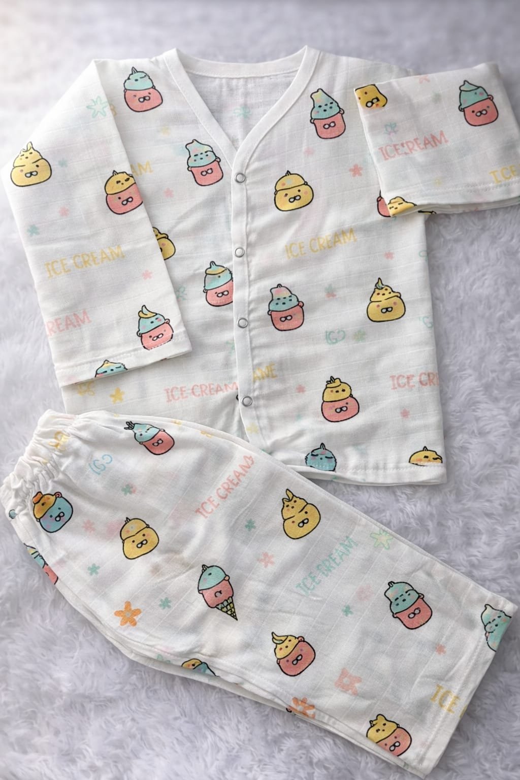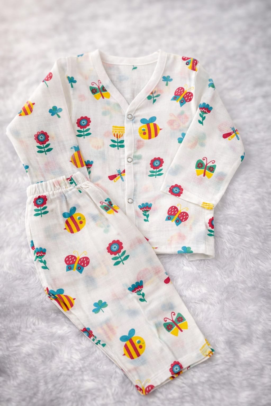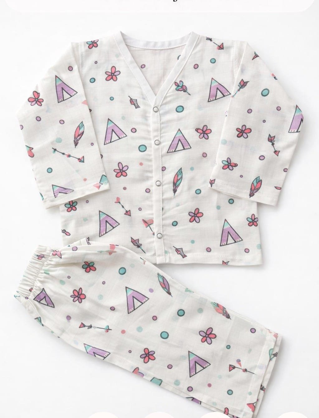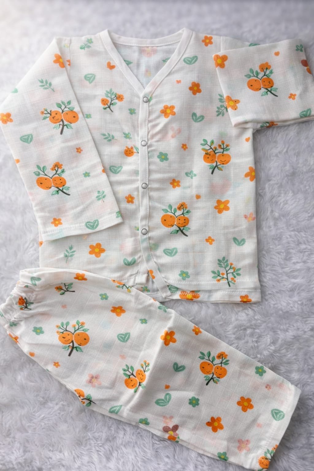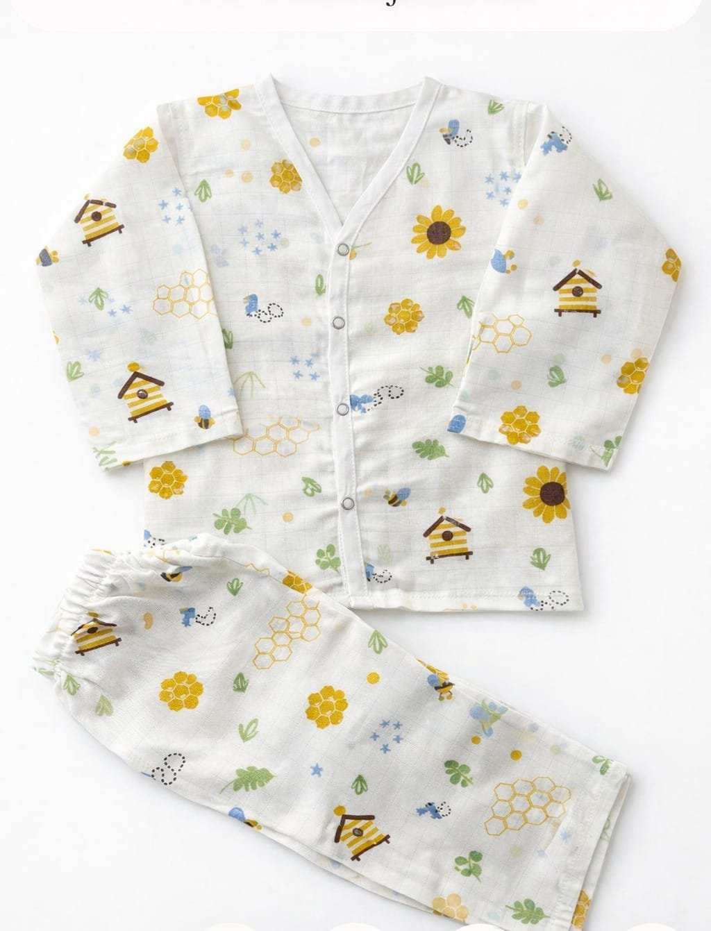 Gentle luxury Night Suites full-sleeve. Made from 100% premium muslin cotton, this night suites is ultra-soft, breathable, and lightweight—ideal for delicate baby skin. The naturally muslin texture allows better airflow, helping keep your baby cool and comfortable all day. Designed for everyday wear, it offers ease of movement and all-day comfort.