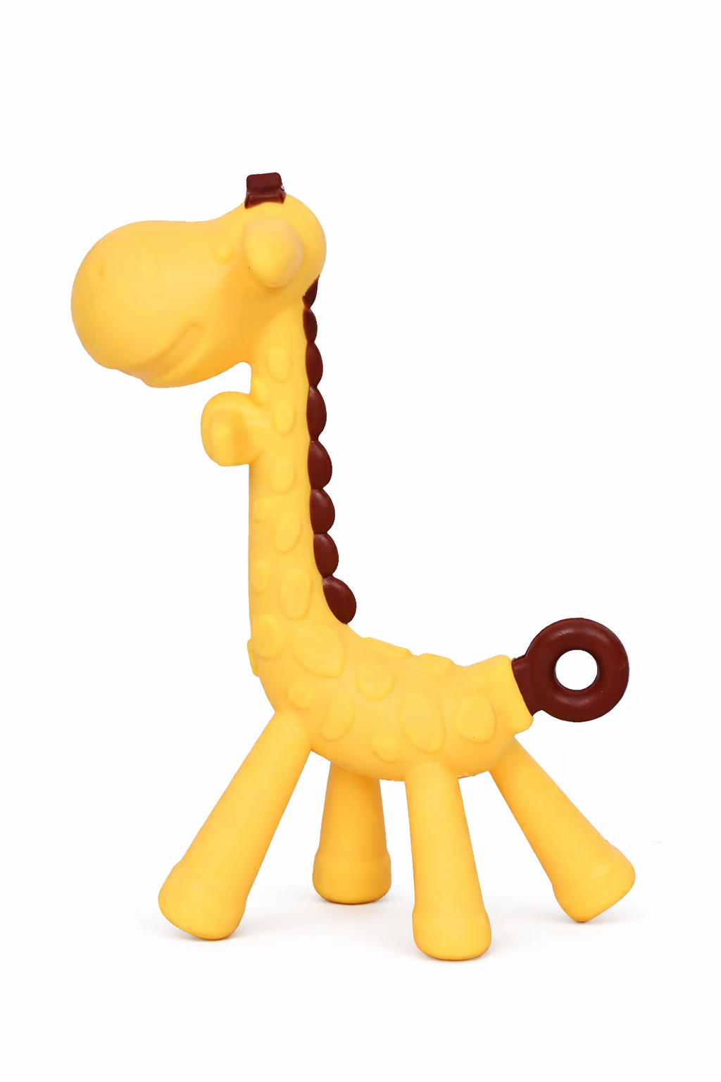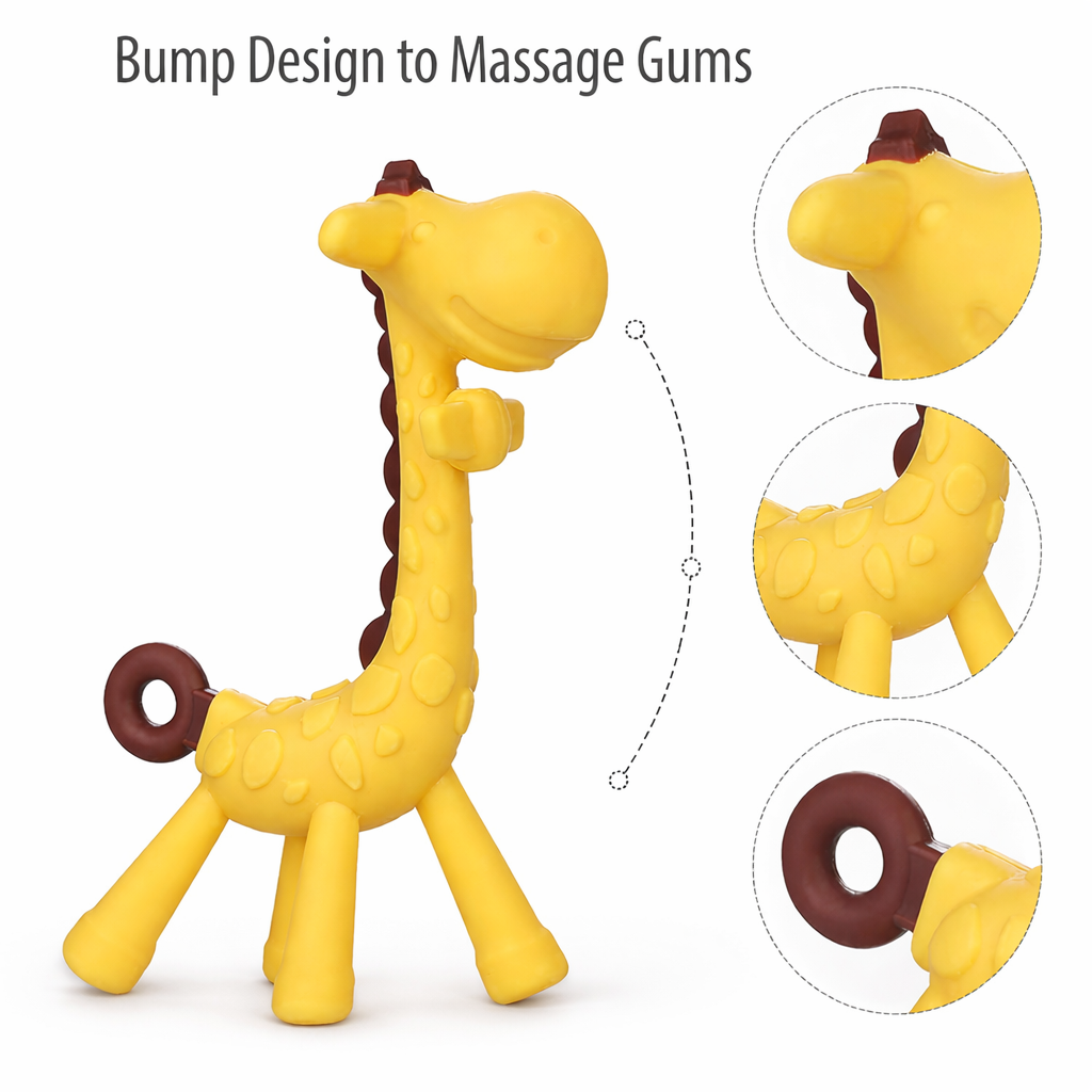 The unique giraffe shape is easy for tiny hands to hold, encouraging independent use while improving grip and motor skills. Its soft yet durable material, combined with textured bump design, gently massages sore gums and reduces teething discomfort.